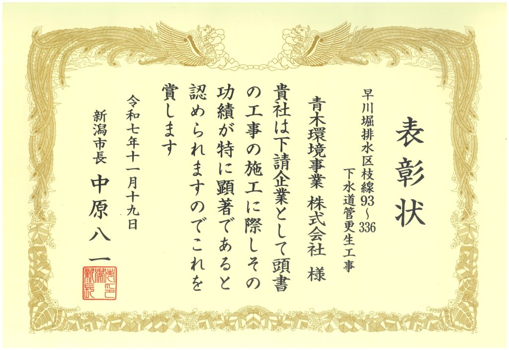 当社はこの度、新潟市から令和7年度優良工事表彰を受賞いたしました。新潟市の下水道管理センターが発注し、株式会社小暮組が請け負った下水道管更生工事において、当社は区長推薦部門で下請企業の1業者として推薦いただきました。